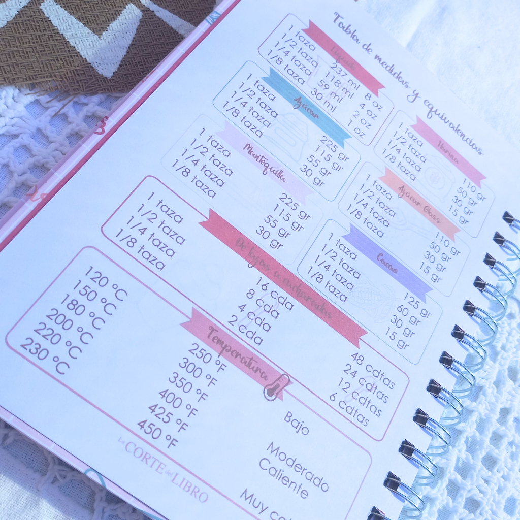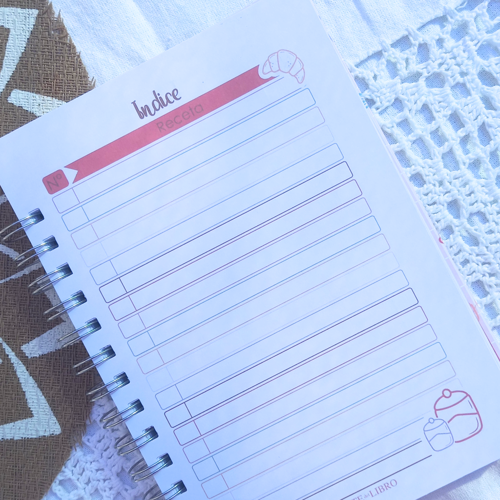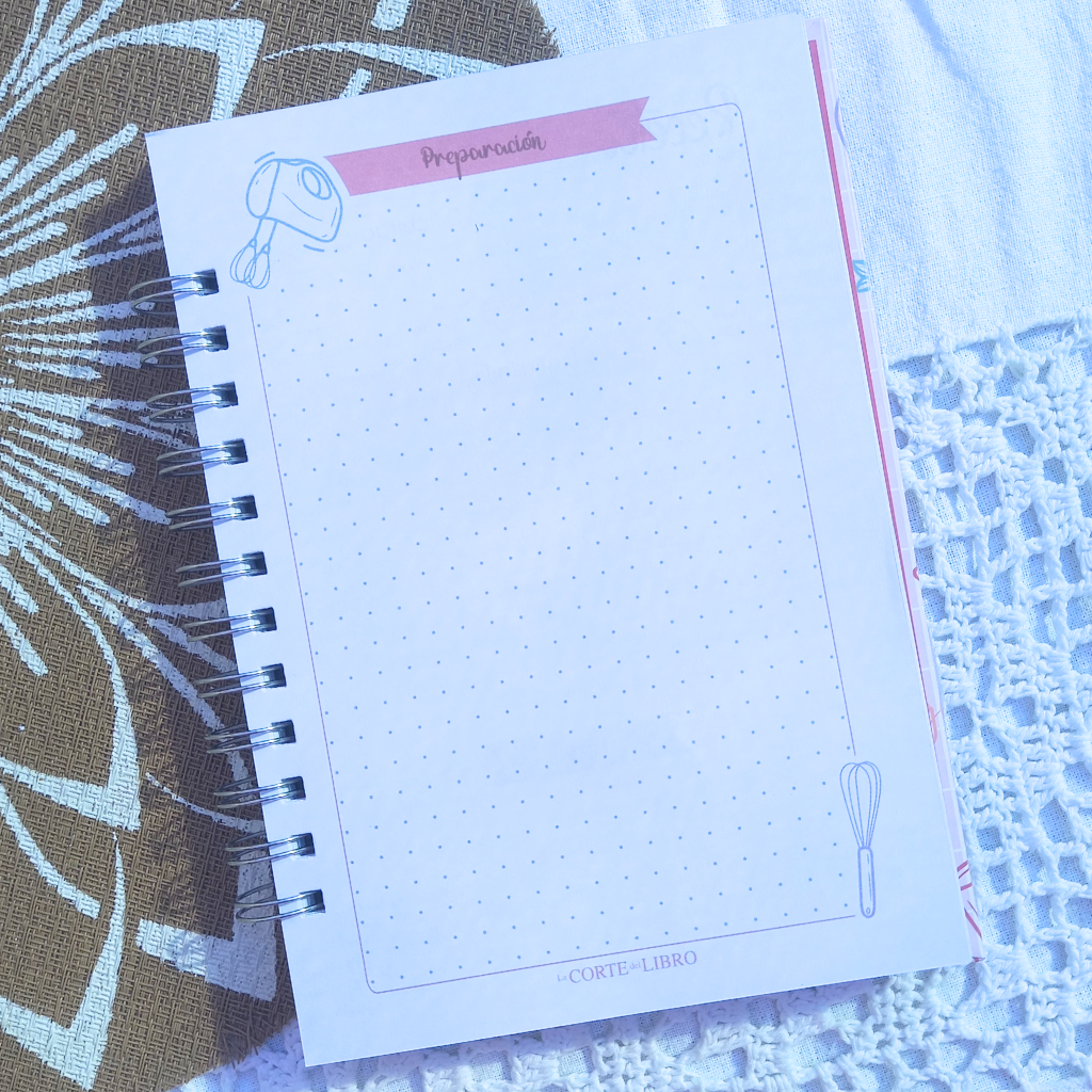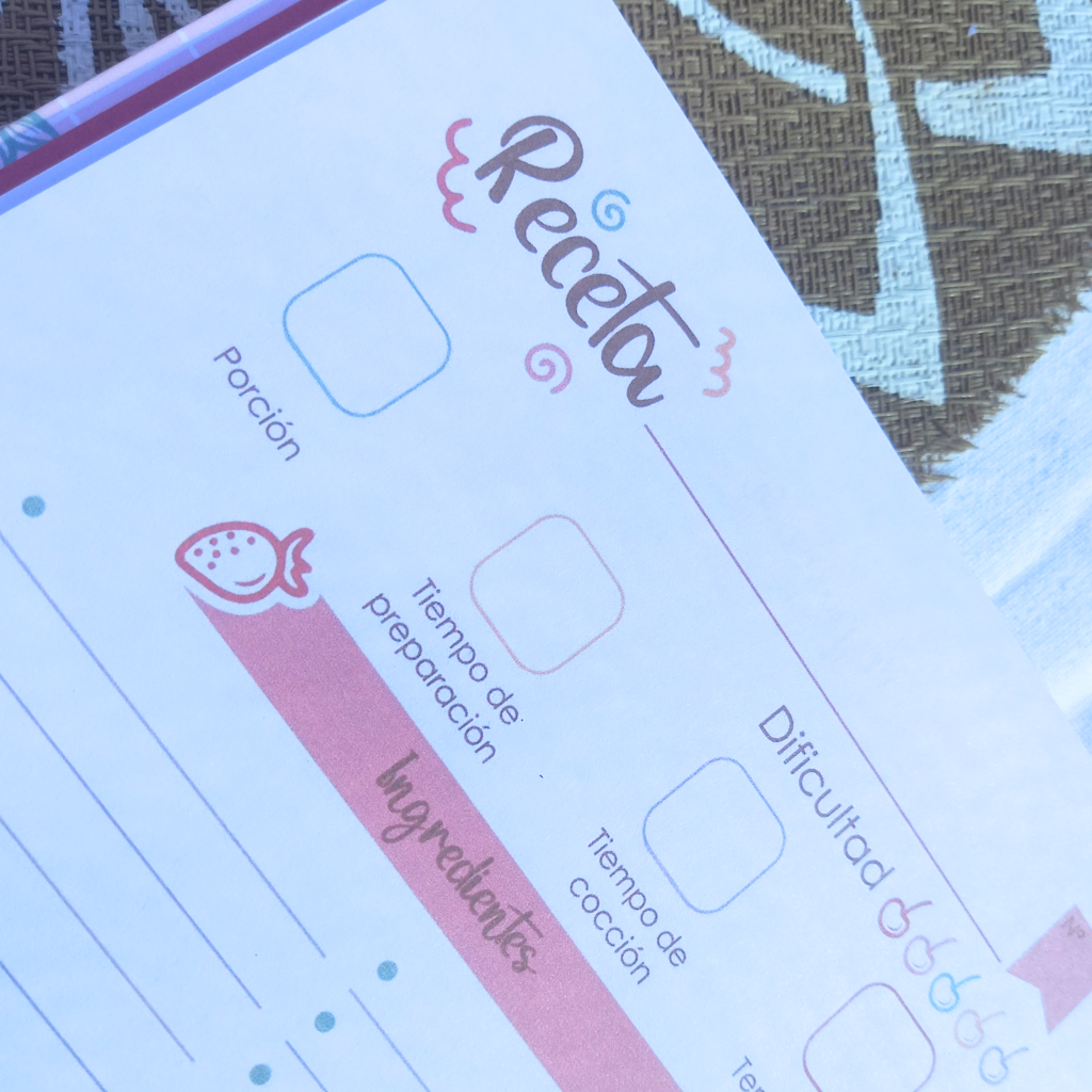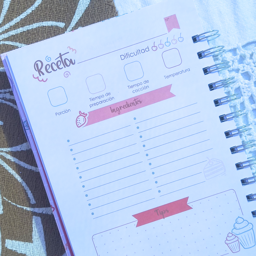 En la página de recetas tiene espacio para anotar el nombre de la receta 🍽️, cantidad de porciones 👥, tiempo de preparación ⏱️, tiempo de cocción 🔥, temperatura 🌡️, ingredientes 🧂, modo de preparación 👩🍳 y nivel de dificultad ⭐.